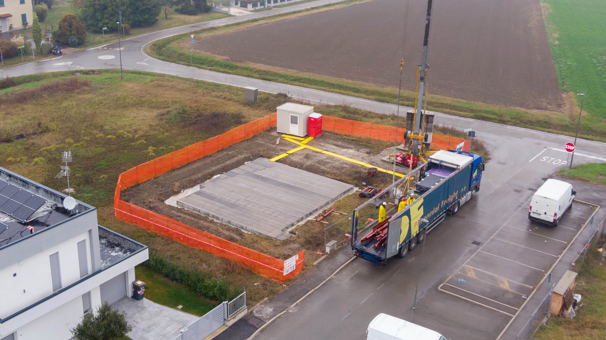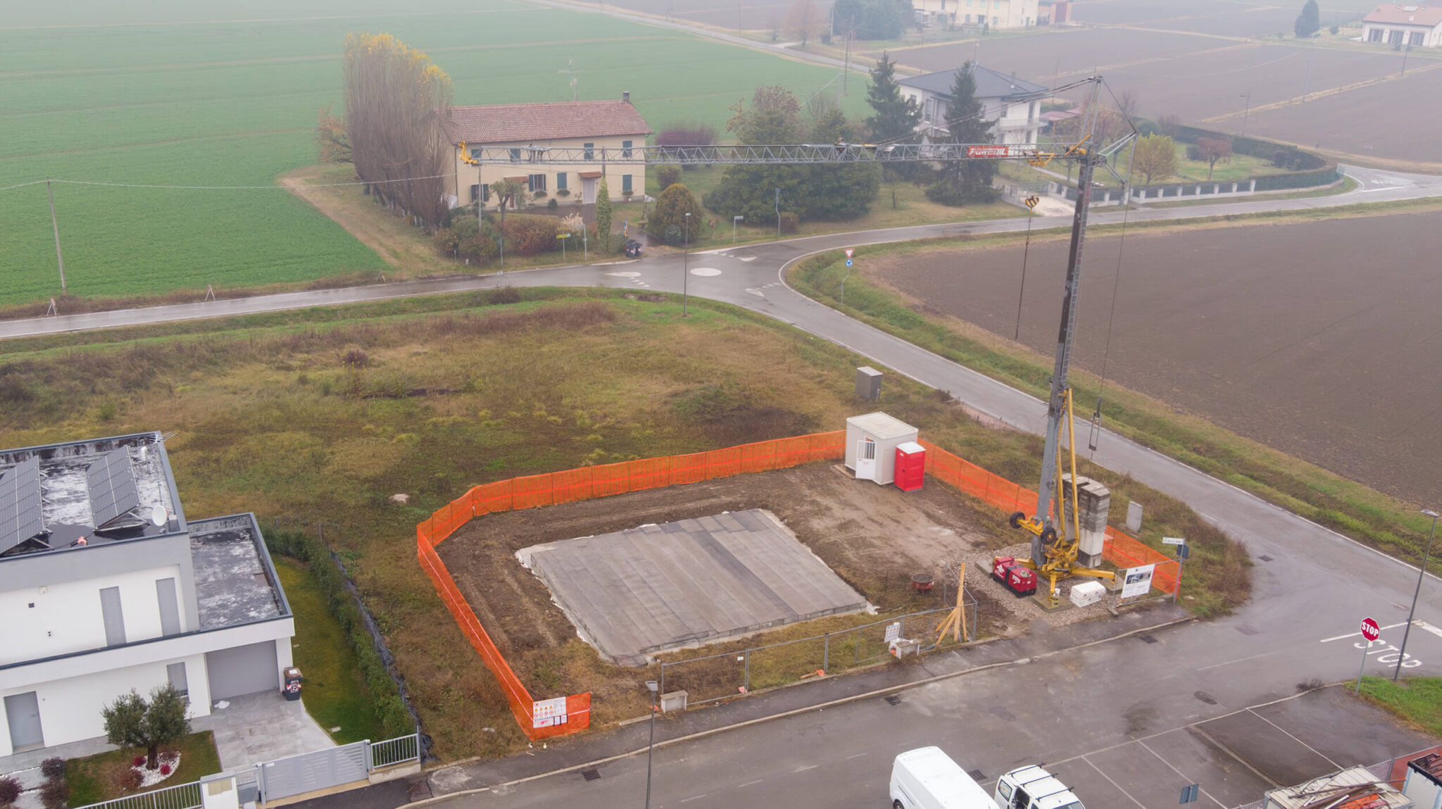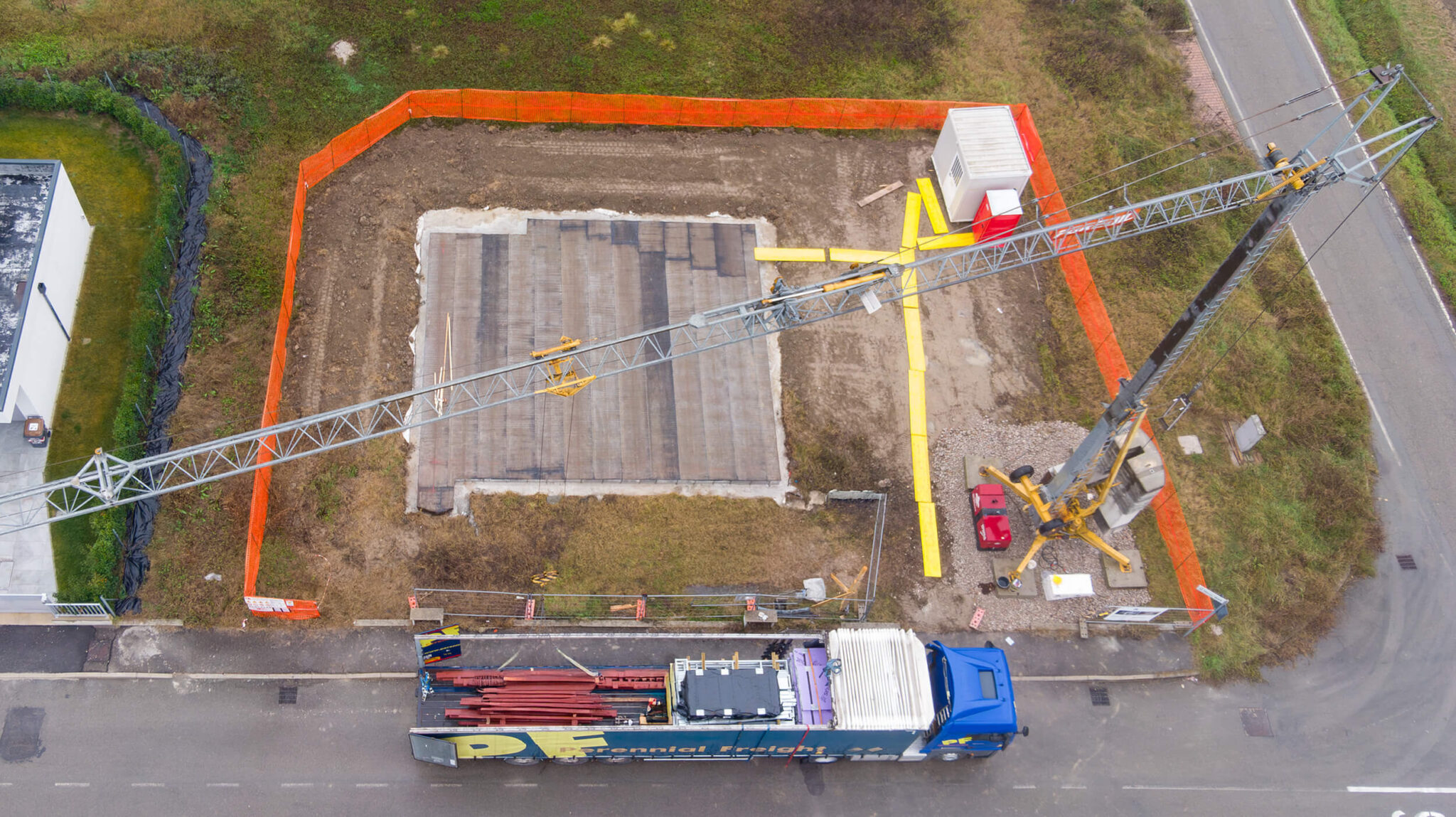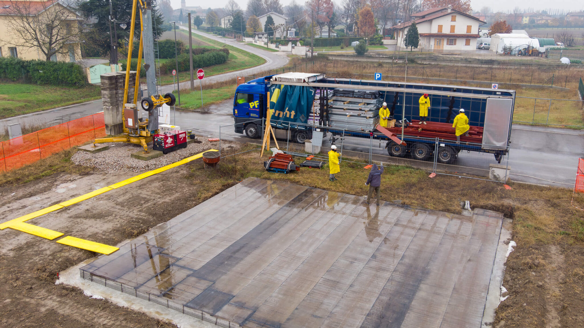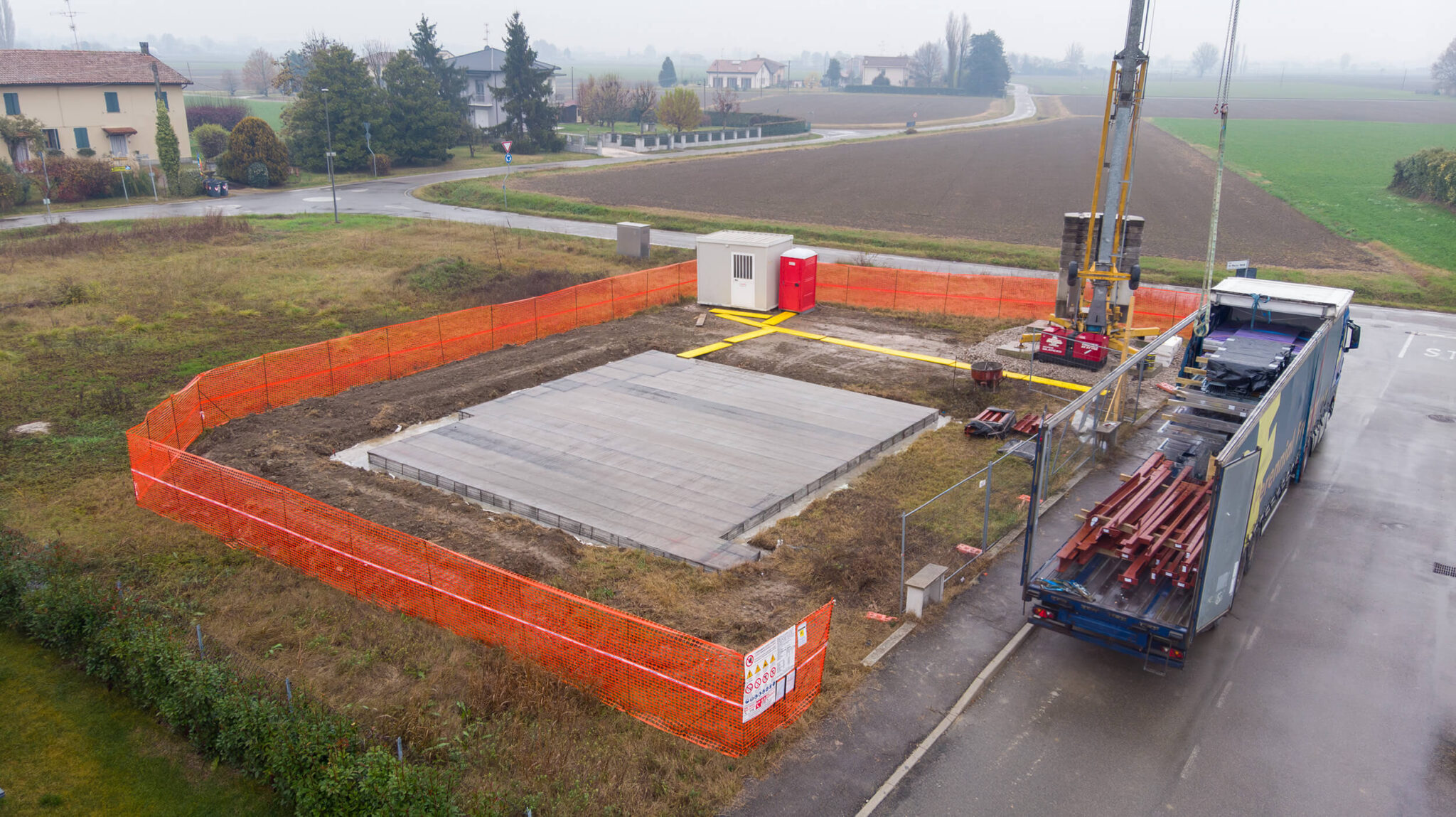 Cronoprogramma lavori: la fondazione su platea è già stata completata. Seguiranno il montaggio dell’intera struttura metallica in 7 giorni nella prima settimana di dicembre, poi le chiusure a secco, predisposizioni impiantistiche e finiture.